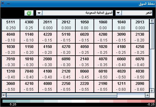 مخطط السوق لقائمة المتابعة يتيح لك المعلومات لجميع الأسهم الموجودة بقائمة المتابعة، حيث تمثل كل خلية من الخلايا الملونة الموجودة في مخطط السوق سهماً واحداً من الأسهم الموجودة في القائمة.